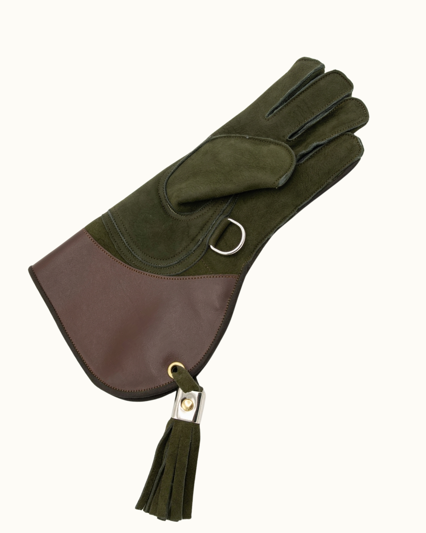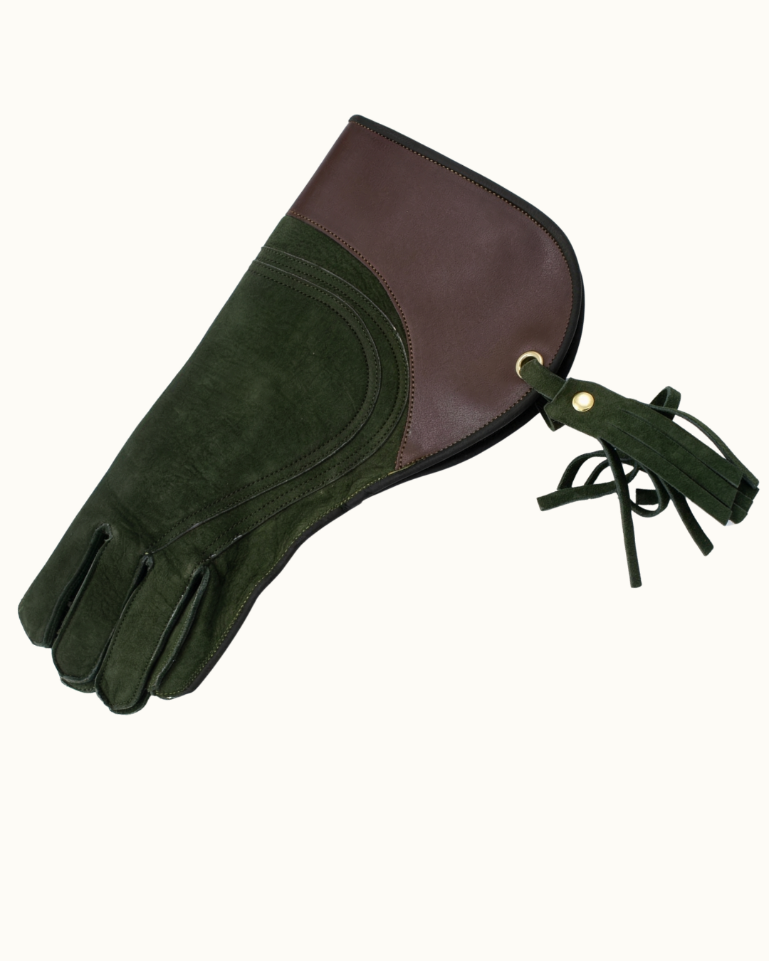 Materiales Combinados: Mano en serraje (ante) verde bosque para máximo agarre y transpirabilidad, con manga en cuero liso marrón (habana) que aporta estructura y durabilidad donde roza la lonja.
