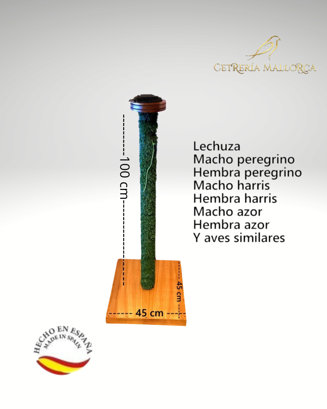 Posadero Alto de Madera Forrado con Césped Artificial (100 cm) Eleva el confort y el bienestar de tu rapaz con este espectacular posadero alto de Cetrería Mallorca. Diseñado meticulosamente para ofrecer un descanso óptimo y seguro, este posadero tipo alcándara o banco alto es la opción perfecta para mantener a tu ave tranquila en su muda, jardín o cuarto de equipo, proporcionándole una excelente visión de su entorno. Características principales: Altura ideal y máxima estabilidad: Con una imponente altura de 100 cm, permite al ave posarse en una posición elevada, lo que reduce su estrés y respeta su instinto natural. Cuenta con una amplia base de madera maciza de 45 x 45 cm que garantiza una estabilidad total, evitando cualquier riesgo de vuelco durante los saltos o aleteos. Poste revestido en césped artificial: El cuerpo central está completamente forrado con césped artificial de alta resistencia. Este detalle no solo aporta un acabado estético muy natural, sino que facilita un agarre perfecto en caso de que el ave necesite trepar o recuperar su posición en la cima. Apto para múltiples especies: Su estructura robusta y el diámetro de su superficie de apoyo lo hacen ideal para aves de tamaño medio y grande. Está especialmente recomendado para: Lechuzas Halcones peregrinos (machos y hembras) Águilas de Harris (machos y hembras) Azores (machos y hembras) Y otras rapaces de porte similar. Calidad 100% Nacional: Fabricado artesanalmente bajo el sello «Hecho en España», garantizando el uso de maderas resistentes, acabados de primera y un diseño pensado exclusivamente para las necesidades reales de los cetreros. El descanso perfecto: Un posadero elegante y altamente funcional que cuida la salud de tu ave, previniendo lesiones en las patas y ofreciéndole una atalaya inmejorable.