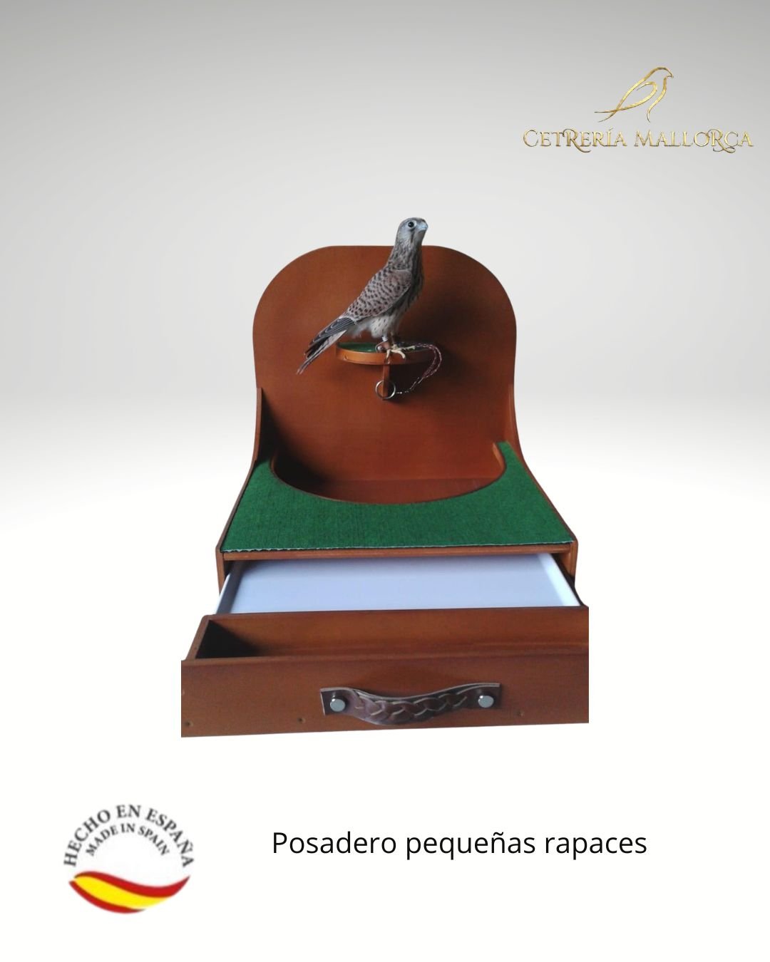 Optimiza el espacio y mantén el entorno de tu ave impecable con nuestro innovador Posadero de Pared con Cajón Integrado. Diseñado específicamente para pequeñas rapaces, este posadero combina la elegancia de un mueble de madera artesanal con la máxima funcionalidad que requiere la cetrería diaria. Fabricado con orgullo y Hecho en España, su diseño de pared permite mantener a tu rapaz elevada y segura, a salvo de corrientes de aire a nivel del suelo o de otras mascotas, convirtiéndose en un elemento decorativo perfecto tanto para interiores como para instalaciones especializadas. Características Principales: Diseño Inteligente 2 en 1: No solo sirve como lugar de descanso para el ave, sino que su cajón inferior es lo suficientemente amplio como para guardar tu guante de cetrería (lúa), lonjas, tornillos o picadas, teniéndolo todo siempre a mano. Máxima Higiene y Limpieza Fácil: El cajón extraíble cuenta con una bandeja interior lisa (color blanco) diseñada para recoger las heces del ave de forma higiénica. Simplemente extrae el cajón, limpia la bandeja en segundos y vuelve a colocarla sin molestar a la rapaz. Confort y Seguridad para el Ave: Incorpora una percha de madera de tamaño adaptado a pequeñas garras, equipada con una anilla inferior de amarre para la lonja. Además, la base está recubierta con césped artificial para proteger el plumaje y amortiguar posibles saltos. Acabados Elegantes: Construcción robusta en madera barnizada, rematada con un tirador metálico rústico en el cajón que aporta un toque de distinción y calidad premium. Medidas (Aproximadas): Altura total: 50 cm Anchura: 45 cm Fondo (profundidad): 42 cm Altura cajón: 10 cm. Especies Recomendadas: Por su ergonomía y tamaño, este posadero de pared es excelente para: Cernícalo Vulgar y Cernícalo Americano (Yankee) Gavilán (machos y hembras) Autillo y Mochuelo Esmerejón Y otras aves de presa de tamaño similar.