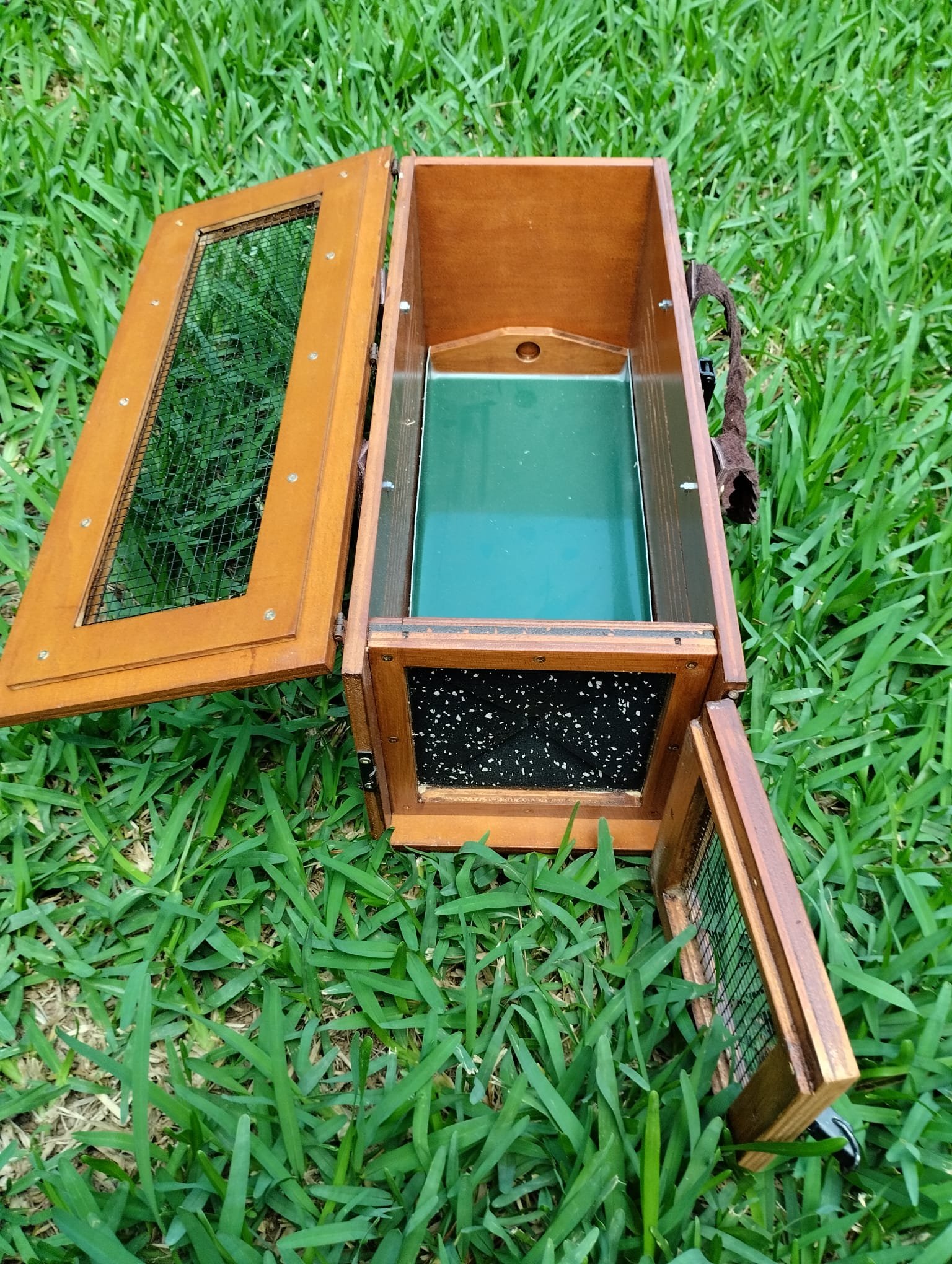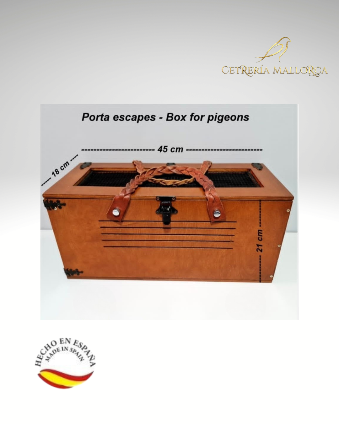 El entrenamiento exitoso de tu rapaz requiere que los escapes lleguen al campo de vuelo en las mejores condiciones. Este Transportín Porta Escapes de la marca Cetrería Mallorca es la solución perfecta, combinando un diseño de estilo clásico con la máxima funcionalidad para el transporte seguro de palomas u otras aves. Características principales: Dimensiones ideales: Con unas medidas exactas de 45 cm de largo, 18 cm de ancho y 21 cm de alto, ofrece el espacio perfecto para transportar varias palomas cómodamente sin resultar un accesorio aparatoso para llevar al campo. Doble sistema de acceso: El diseño es sumamente práctico, contando con una amplia tapa superior abatible para facilitar la carga inicial, y una puerta lateral más pequeña. Este sistema permite sacar las aves de forma rápida, segura y controlada justo en el momento del entrenamiento. Ventilación óptima: Para garantizar el bienestar y reducir el estrés de los escapes, la caja incluye ranuras horizontales en el panel frontal y resistente rejilla metálica tanto en la puerta superior como en la lateral, asegurando un flujo de aire constante. Higiene y limpieza: Su interior está pensado para el uso continuo. Cuenta con una base inferior lisa tipo bandeja que facilita enormemente la retirada de suciedad y excrementos tras cada jornada. Acabados artesanales Premium: Fabricado en madera robusta, incorpora herrajes, un cierre de seguridad frontal y cantoneras metálicas decorativas de estilo rústico. Destaca especialmente su asa superior de cuero trenzado, que además de darle un toque muy elegante, ofrece un agarre muy cómodo. Fabricación Nacional: Orgullosamente «Hecho en España», lo que garantiza una manufactura cuidada y el uso de materiales duraderos. El complemento definitivo para tus entrenamientos: Un cajón porta escapes que cuida los detalles al máximo, siendo tan bonito a la vista como resistente y funcional para el día a día del cetrero.