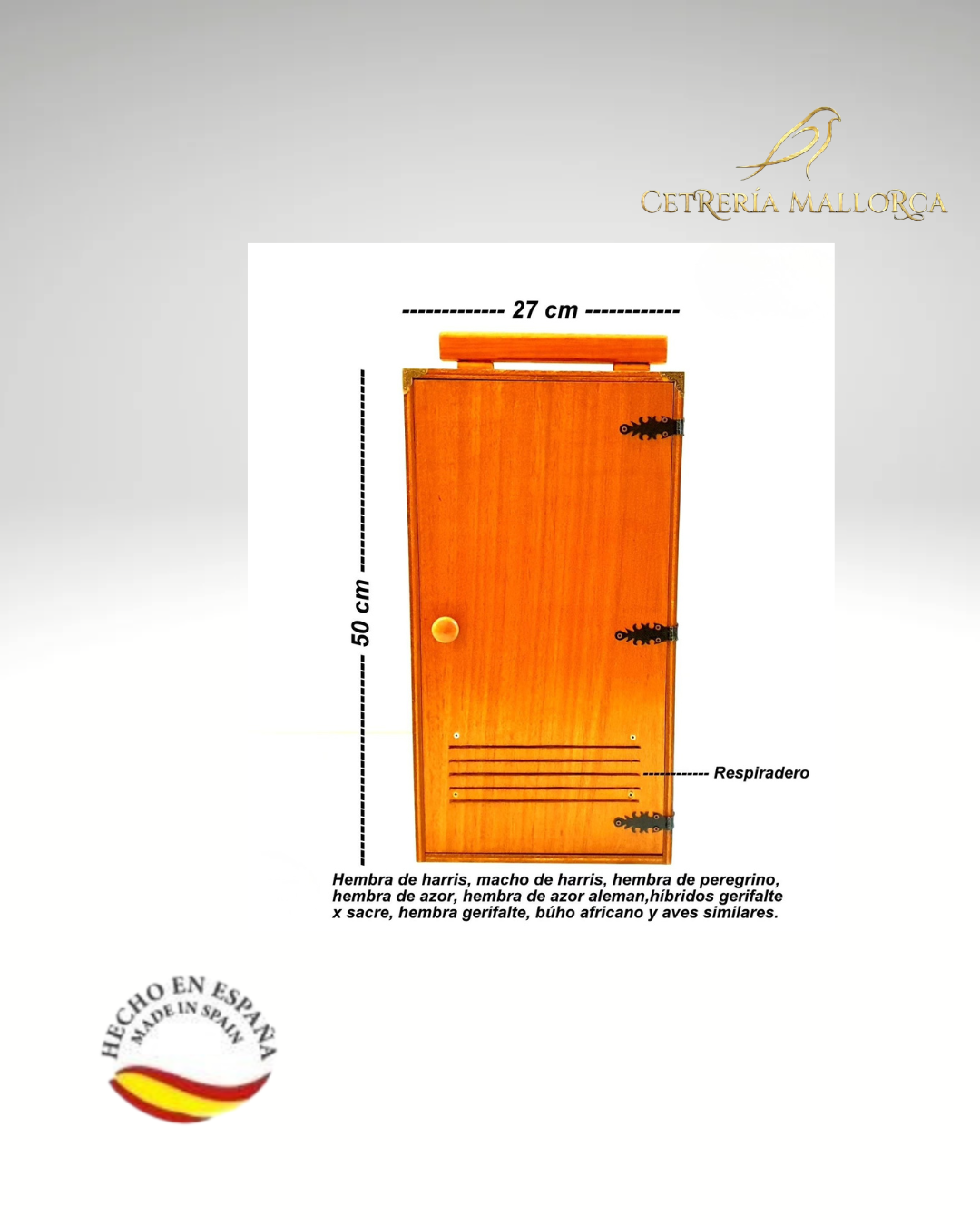 Garantiza la máxima seguridad, tranquilidad y confort de tu ave durante cada desplazamiento con nuestro Transportín de Madera Premium. Diseñado minuciosamente para cubrir las exigencias de los cetreros más detallistas, este transportín combina una estética rústica y elegante con soluciones prácticas para el día a día. Fabricado de manera artesanal y orgullosamente Hecho en España, su estructura de madera barnizada protege al ave de estímulos visuales externos, reduciendo su estrés en los viajes, mientras que sus amplias dimensiones aseguran que el plumaje se mantenga intacto. Características Principales: Higiene Inteligente: Cuenta con un sistema de bandeja extraíble en la base que permite recoger y limpiar los excrementos de forma rápida y sin necesidad de invadir el espacio del ave, manteniendo el habitáculo siempre impecable. Ventilación Óptima: Incorpora unas ranuras de respiradero estratégicamente ubicadas en la parte inferior de la puerta principal para asegurar un flujo de aire constante. Acabados de Alta Calidad: Detalles que marcan la diferencia, como sus bisagras rústicas decorativas, cantoneras protectoras en las esquinas superiores y un asa de madera robusta para un transporte equilibrado y seguro. Dimensiones Espaciosas: 50 cm de altura x 27 cm de anchura x 50 cm de fondo. Un diseño con la profundidad perfecta para evitar que las plumas de la cola (timoneras) rocen o se estropeen durante el trayecto. Especies Recomendadas: Por sus dimensiones y diseño, este transportín es ideal para: Águila de Harris (machos y hembras) Halcón Peregrino (hembras) Azor y Azor Alemán (hembras) Híbridos de Gerifalte x Sacre Gerifalte (hembras) Búho Africano Y otras aves de presa de porte y tamaño similar.